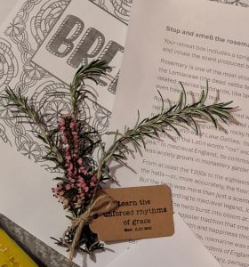 Your retreat box includes a sprig of a herb, rosemary. Rub the leaves and inhale the scent produced by the essential oils in the plant.